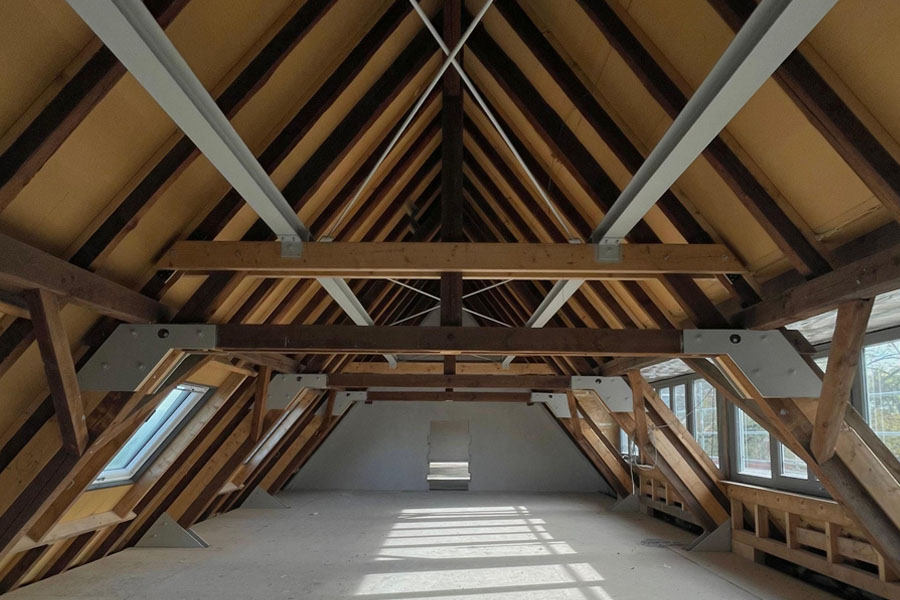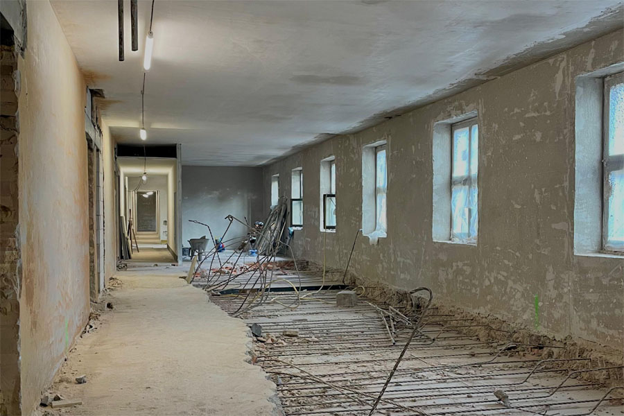 Die Rohbauarbeiten im Bestandsgebäude befinden sich in den letzten Zügen. Derzeit werden die Geschossdecken ausgetauscht.