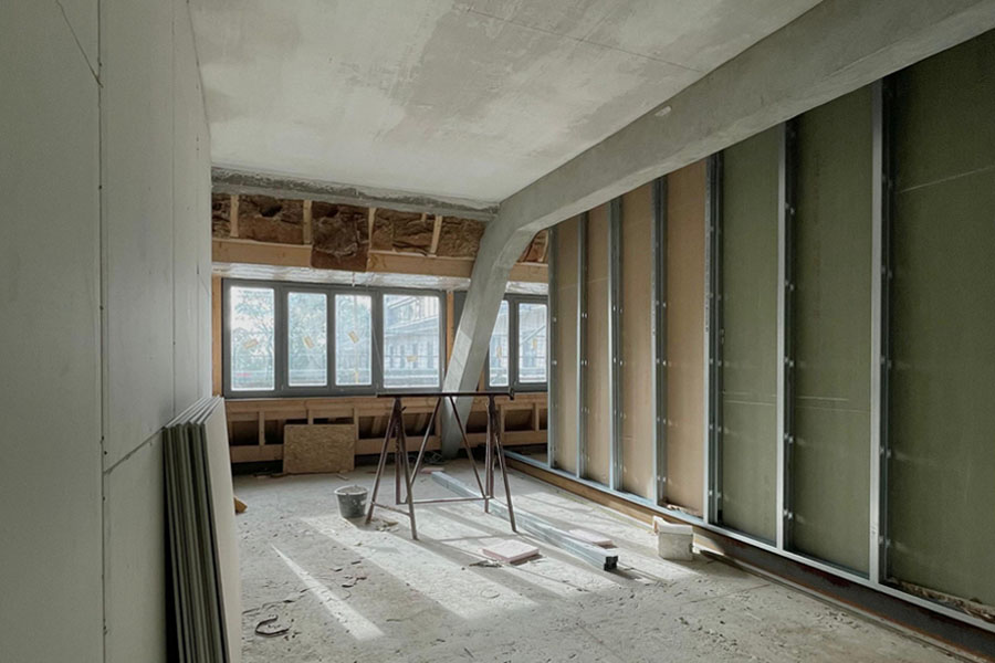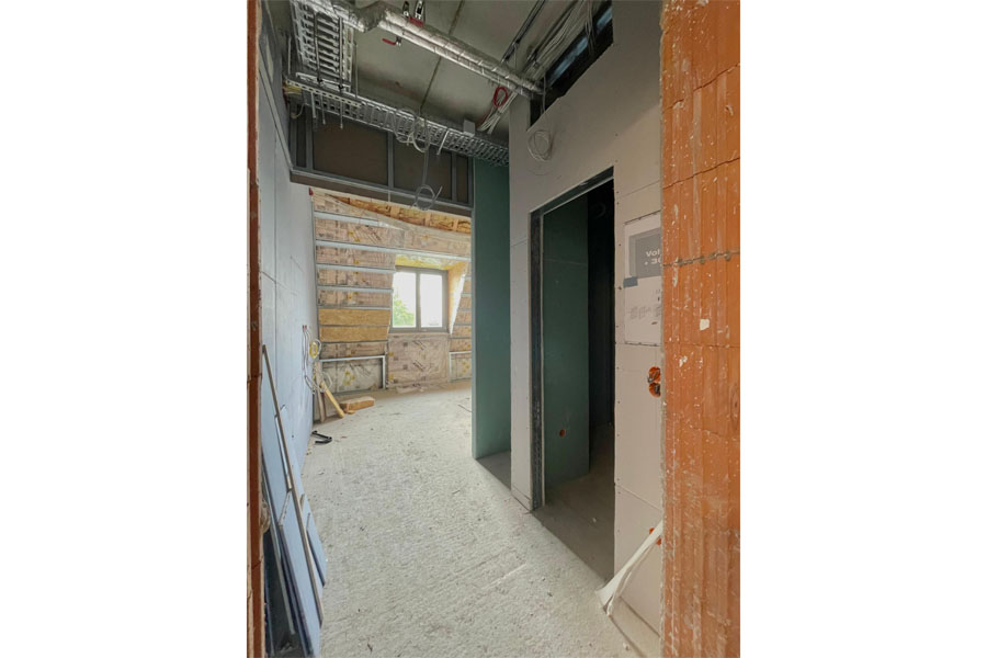 Die Trockenbauarbeiten konnten in Teilbereichen bereits abgeschlossen werden, und die ersten Räume sind verputzt.